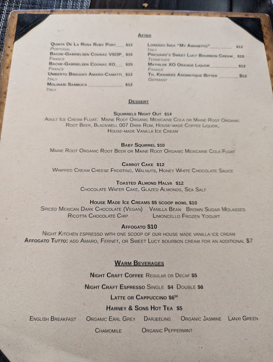 - Desserts like the Warm Cookie Amaretti ($7) and the decadent Souffle Cheesecake ($14) take center stage, perfect for those with a sweet tooth.